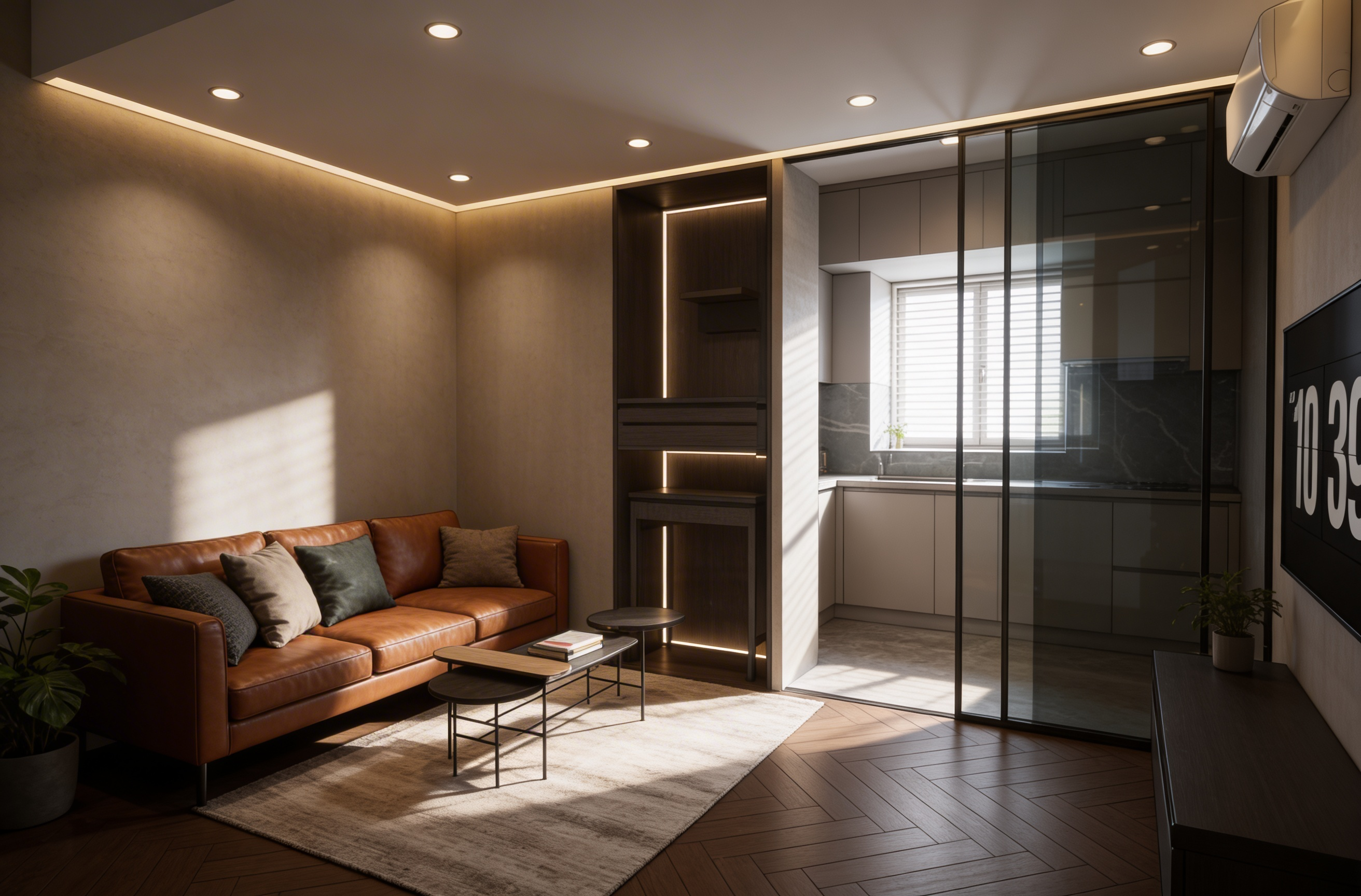 - ● Giải pháp: Ưu tiên phá tường ngăn lấy sáng, dùng vách kính và nội thất đa năng để tối ưu diện tích cố định.
