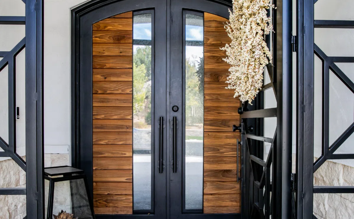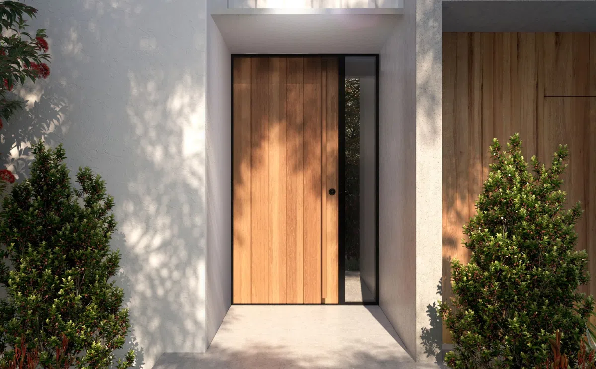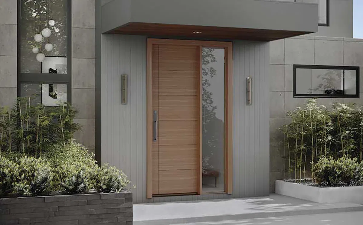 Cửa kết hợp kính bên hông giúp mở rộng tầm nhìn và đón sáng tối ưu. Đường nét tối giản, phù hợp cho kiến trúc hiện đại.